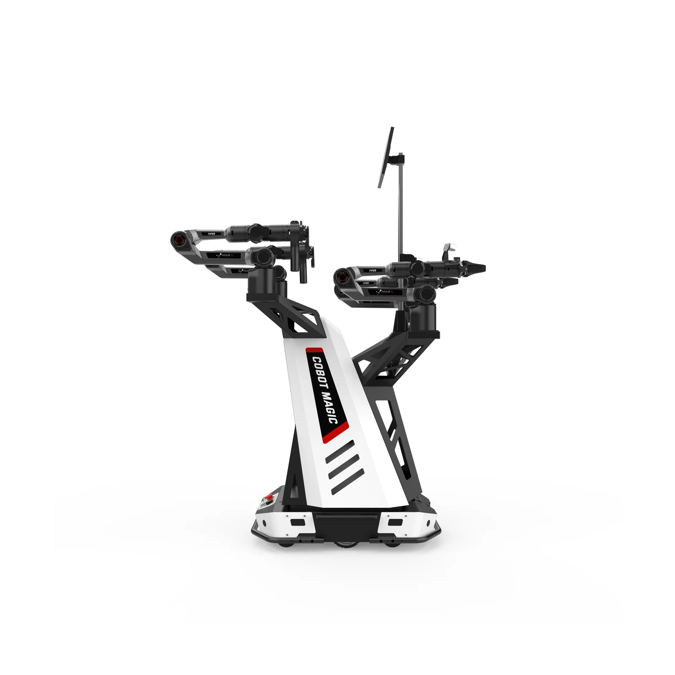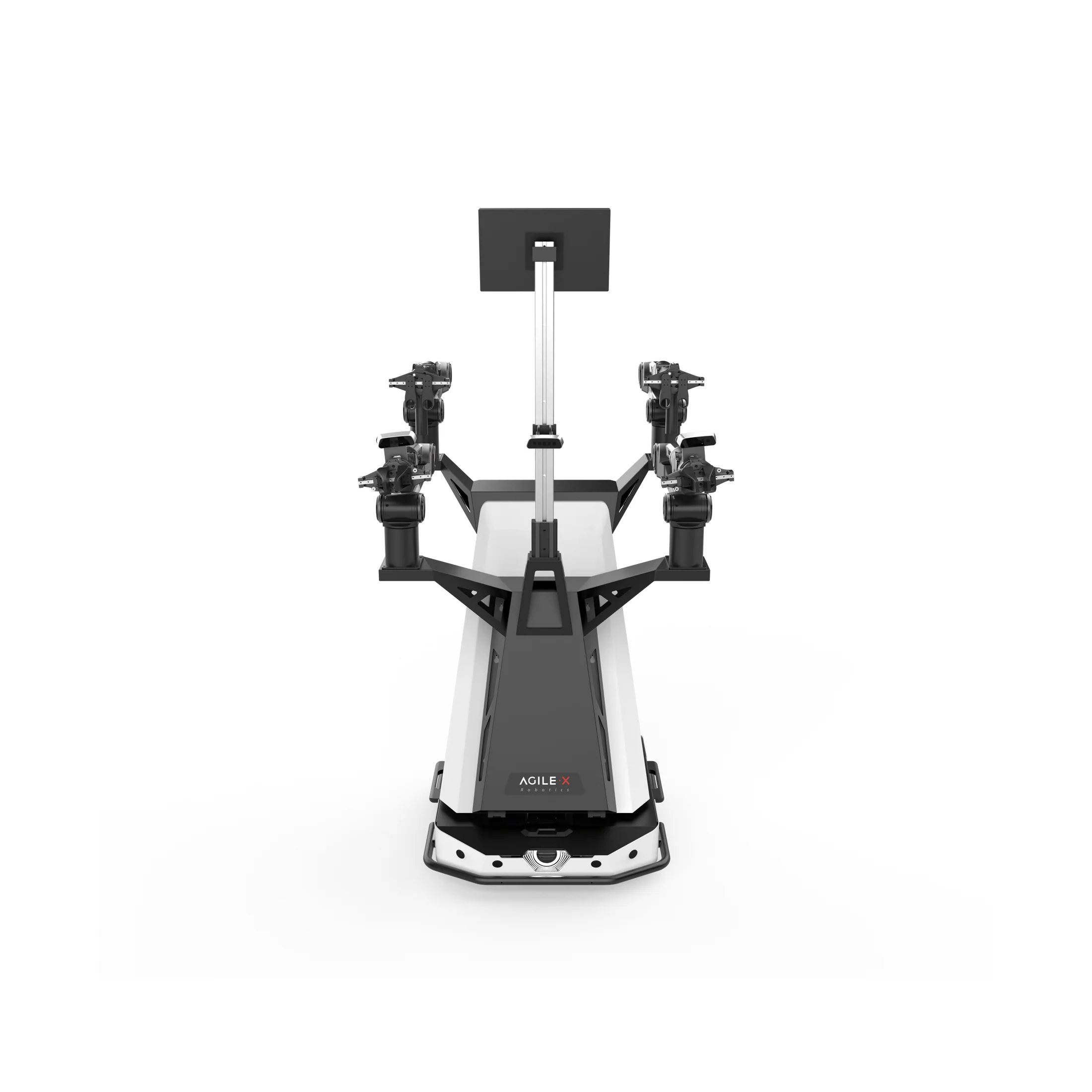 Its hardware is based on 4 robotic arms , equipped with 2 wrist cameras and 1 top camera, and a mobile base from AgileX Robotics Tracer differential motion robot.